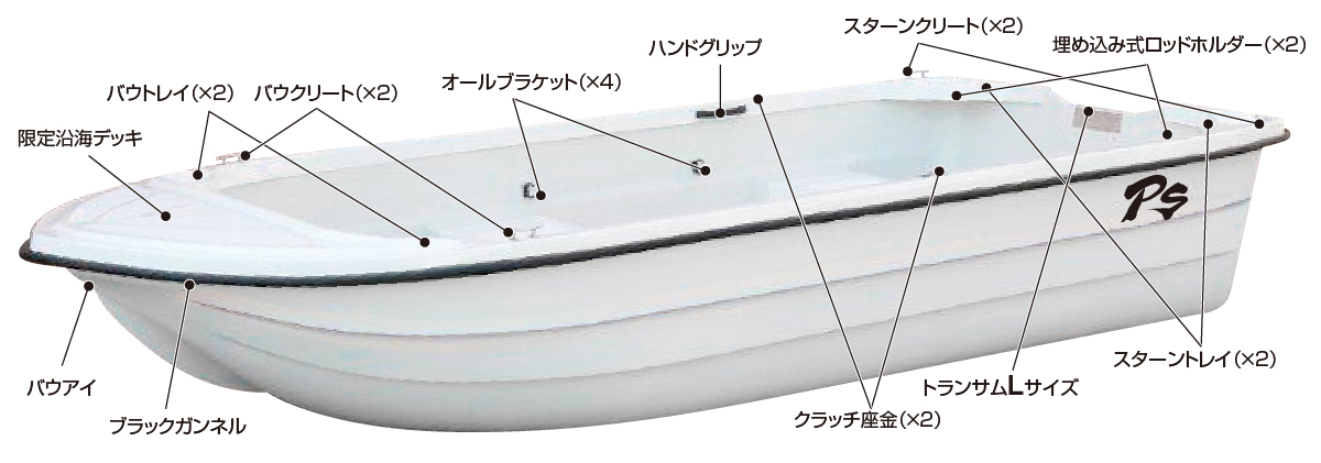 | 全長 (m) | 全幅 (m) | 深さ (m) | 重さ (kg) | 定員 (人) | 2馬力搭載 | 予備検査済 (最高馬力) | トランサム | 予備検 |