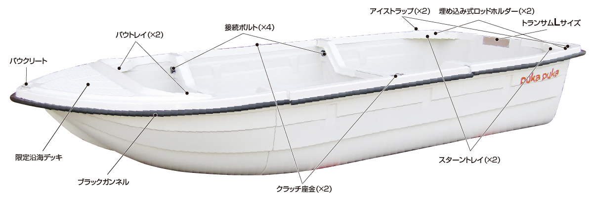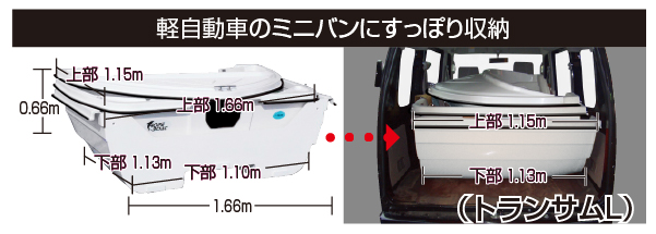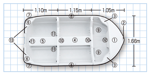 | 全長 (m) | 分解時 (m) | 全幅 (m) | 深さ (m) | 重ねた時 高さ(m) | 重さ (kg) | 定員 (人) | 2馬力 搭載 | 最高馬力 | トランサム | 予備検 |