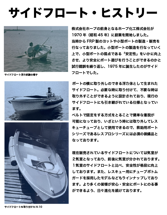 | 1975年(昭和50年) | フィッシングボート H-10シリーズ(一体型・組み立て型) 発売 サイドフロート開発・販売 |