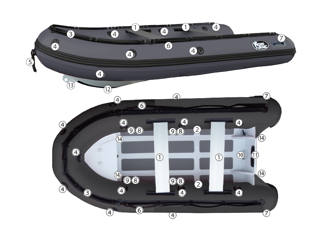 | 全長(m) | 全幅(m) | チューブ径(m) | 船内長(m) | 船内幅(m) | 重さ(kg) | 気室 | 定員(人) | 馬力 | トランサム | フロア |