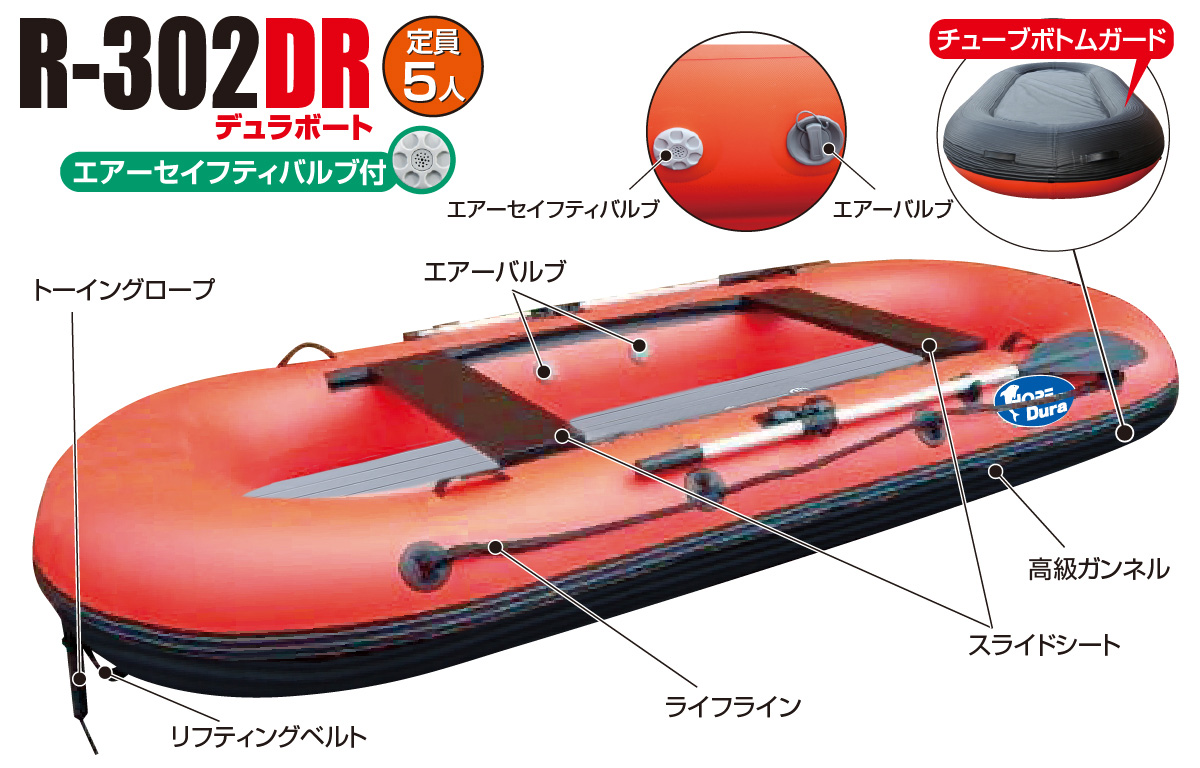 | 全長(m) | 全幅(m) | チューブ径(m) | 船内長(m) | 船内幅(m) | 重さ(kg) | 気室 | 定員(人) | |