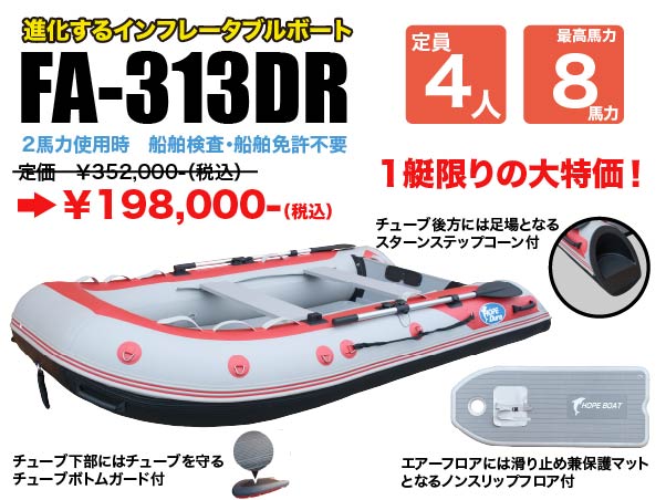 | HOPE | FA-313DR | - | 全長(m) 3.18 全幅(m) 1.60 高さ(m) 0.52 重さ(kg) 約49 定員(人) 4 最大馬力 8 トランサムサイズ S 定価 ¥352,000 | 限定1台限りの特別価格 198,000