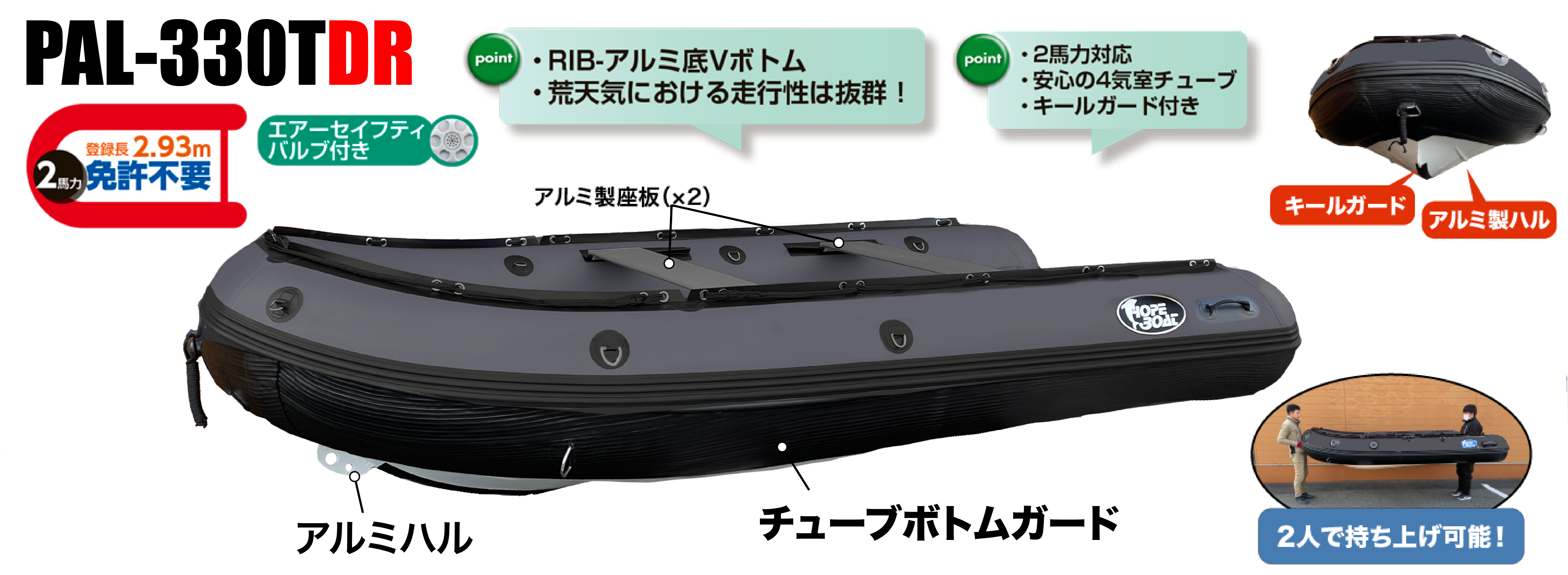 | 全長(m) | 全幅(m) | チューブ径(m) | 船内長(m) | 船内幅(m) | 重さ(kg) | 気室 | 定員(人) | 最高馬力 | トランサム | フロア |